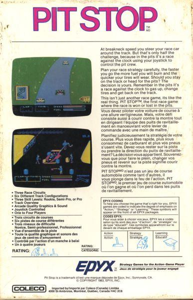Pitstop is an action racing game featuring six different race tracks. Your goal is to earn as much money as possible by winning races in the Grand Circuit which consists of a race on each of the six tracks; each time a race is completed, you'll earn money based on how you placed and the number of laps completed before moving on. While you are racing, keep an eye on your tires and fuel; if your tires become too worn (causing a blowout) or you run out of fuel, the game will be over. To prevent this from happening, you'll need to make a pitstop. Here you control the pit crew and can replace tires and refuel. While in the pit the race is still going on, of course, so repairs need to be made as quickly as possible to get back into the race without losing too much ground. Several game options are available to control the level of difficulty and the number of laps. In addition to the Grand Circuit which is the full race, you can also practice a track in a single race or enter the mini circuit which consists of three races.