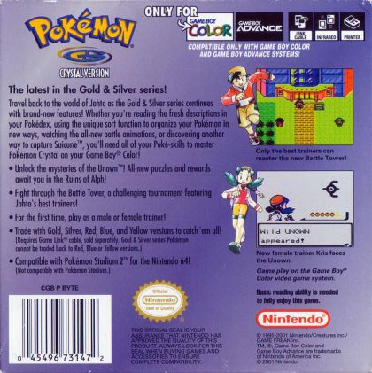 Pokémon Crystal Version (Japanese: ????????? ?????????? Pocket Monsters Crystal Version) is the third and final Generation II main series game for Game Boy Color. It was released as a sister game to Pokémon Gold and Silver, which were released one year before. It was released in Japan on December 14, 2000, in North America on July 29, 2001, and in Europe on November 2, 2001.