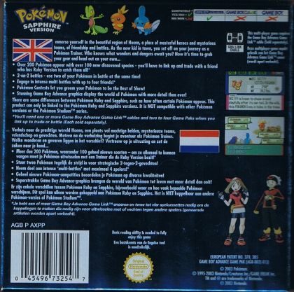 Pokemon Sapphire takes you into an immersive and more exciting new adventure as you travel and train to become a Pokemon master! You'll have to become a hero by helping Team Magma stop Team Aqua from flooding the world for control of the water Pokemon! Special features like connectivity with future GameCube games Link cable support for up to 4 players Supports e-Reader Only for Game Boy Advance