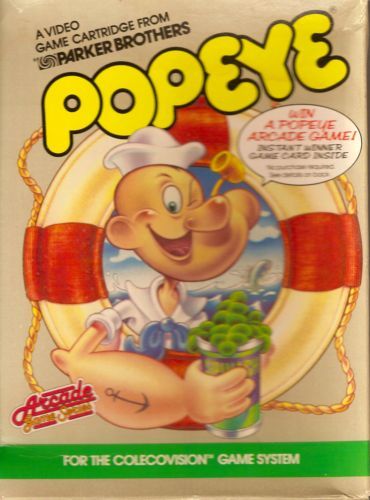 Popeye is a conversion of the arcade action/platform game. As Popeye, you are trying to win Olive Oyl's love! She is at the top of the screen dropping tokens of her love, and you need to collect them before they hit the ground. After you have collected the required number of items, you can move on to the next, more difficult level. There are many obstacles trying to stop you from completing your task, though! Brutus wanders around the screen and is constantly trying to catch you. If you collect a can of spinach, you can temporarily knock him out, otherwise Brutus will knock you out. Other objects such as bottles or birds are also flying around the screen and will cause you to lose one of your lives if you are hit. Each level features a different layout of platforms and ladders, and will have you collecting different items as they float towards the bottom of the screen!