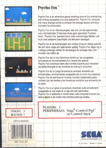 Psycho Fox is a platform game where you play a fox and you must get through seven worlds, consisting of three areas each. At the end of each world, there are one of seven bosses waiting to destroy you, but some of the later bosses are exactly the same as the earlier ones. The title is a bit misleading because you can also play as three other characters including Hippo, Leopard, and Monkey Boy. Each character has their own disadvantages. For example, Hippo is much slower than the other three. However, all the characters share one thing in common: they can use their fists and punch enemies as they approach them. They can also jump on them and keep knocking them in the ground until they disappear off the face of the earth. If they don't make them disappear, they will pop back out again and set out for revenge. Obstacles are scattered through each area, including spikes, cannonballs, esculators, fireballs, and steam.