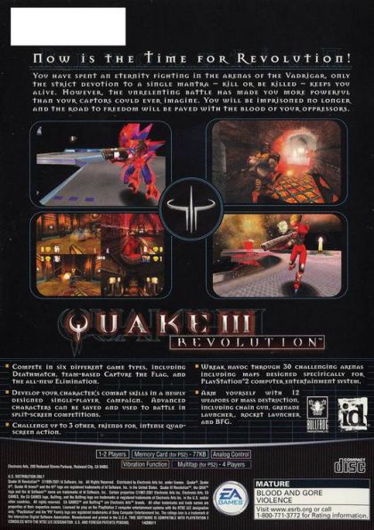 Quake III Revolution is designed as a multiplayer game. You and three friends can fight it out in a multiplayer Deathmatch to determine who's the fastest, quickest, and the deadliest. There are many other options available as well -- choose from Team Deathmatch, where you and a few friends can play on the same team against computer-generated opponents, Capture the Flag, Single-Weapon Deathmatch, and Possession. In addition to the multiplayer modes, Quake III includes the Single-Player Challenge Modes found in the PC version, such as Deathmatch, Kills Vs. Time, Possession, One Flag Capture the Flag, Elimination, and Skirmish. The game also features a wide armament, including new weapons such as the Gauntlet, Machine Gun, and Railgun, as well as original Quake weapons like the Rocket Launcher and Grenade Launcher. The game includes both the Proximity Mine Launcher and Nail Gun, both of which are exclusive to this PS2 version. Choose from a roster of 41 warriors, from aliens to soldiers, as you combat in a variety of arenas, ranging from an eight-player deathmatch arena to one-on-one arenas. As with others in the series, the game is played entirely from a first-person perspective and supports analog control, force feedback, and up to four players with the PlayStation 2 Multitap. Each saved game takes up to 77KB on the standard PlayStation 2 Memory Card.