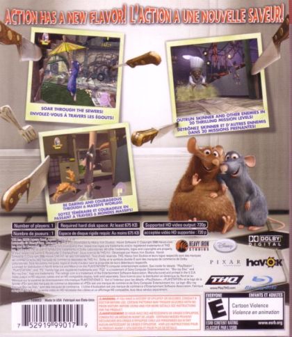 Ratatouille is based on the Disney/Pixar film and brings the fun and laughs of the movie to your Playstation 3. Ratatouille features an acrobatic rat named Remy who must balance his love for cooking with loyalty to his family. Features major voice talent from the film