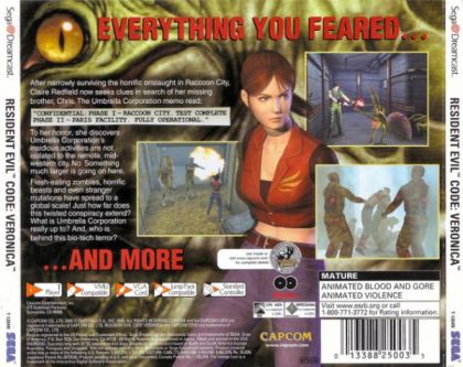 Resident Evil Code: Veronica takes up the story of Claire Redfield, a character from Resident Evil 2. In that game she was searching for her brother Chris (a missing S.T.A.R.S. member) and in Resident Evil Code: Veronica we follow her to Europe where she continues her search at Umbrella headquarters.