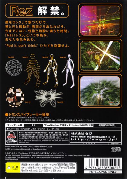 This text refers to the PlayStation 2 version of this title. Sega's first year of third-party publishing brings this distinct, genre-crossing action title to the PS2. Rez blends elements of 3D shooters and rhythm-and-dance games to create an experience custom designed for fast action and psychedelic visuals. The game is set in the ethereal networks of the world's master computer, which is suffering a personal breakdown upon realizing its own sentience. A hero must enter the network to find and rescue this newly aware system core, known as "Eden." Firewall "bosses" and other security devices threaten at every turn. The player controls a wire-frame character who moves forward "on a rail" through the game's graphically eclectic environments. Different objects appear that must be shot in time to remove them from the screen. Music and lighting effects attune to the hero's rhythm as he blasts away at enemies. As the player progresses through the game, characters and graphics become more visually arresting as the speed and number of targets increase.