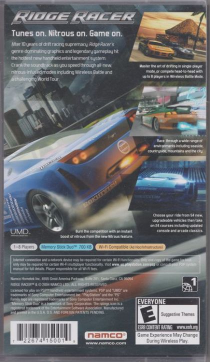 The nitrous boosting racing game everybody knows and loves is now available on the Sony PSP. Scorch some asphalt in 24 circuits of breakneck speed and exhilaration - that's all that stands between you and glory. Beat the clock in Time Attack Mode or test your racing skills against up to 8 players in WiFi compatible Wireless Battle Mode. Drive in style and rise through the ranks to unlock hidden bonuses in World Tour Mode. Features popular racecourses from arcade classic Rave Racer and the entire Ridge Racer series -- old favorites like Seaside Route 765, Crimsonrock Pass and Greenpeak Highlands.