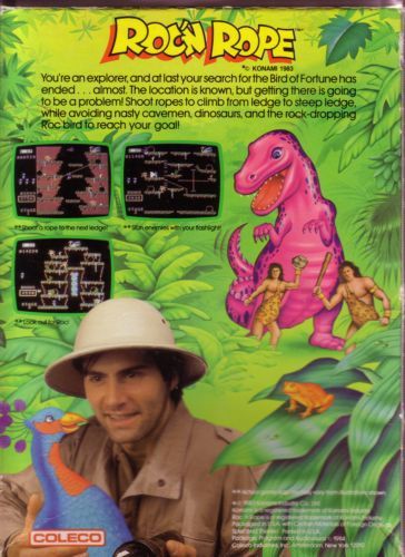 Your player is a mountain climber who must avoid cavemen, dinosaurs and pterodactyls as he climbs up the cliff-sides. Your goal in each level is to climb up and reach a mystical bird with great plumage, while staying one step above the bonus timer which determines how long you may stay on each level. The mountain climber has only one ability; to shoot rope at 45 degree angles which he may then climb up to other platforms. His other action is a stun beam which will allow him to walk past enemies who get too close; but will only work horizontally from him. As for power-ups, on each level is (usually 2) a flashing diamond power-up which will make him invincible and allow him to defeat monsters. Also as a power-up are glowing treasures of some kind which are worth extra points.