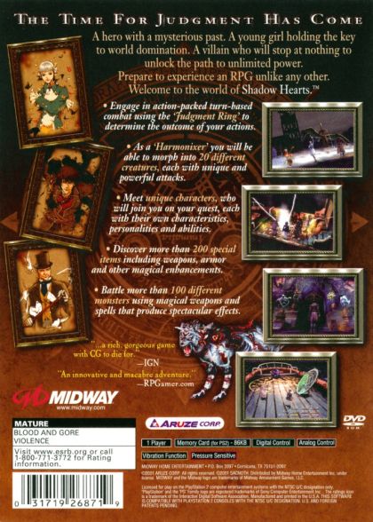 Shadow Hearts is a role-playing adventure of romance and the occult, set in the early 1900s and driven by a turn-based combat system. Players take the role of Yuri Hyuga, an "Harmonixer" who can take the forms of other creatures and beasts. Following a soft voice in his head, the hero finds himself rescuing Alice Elliot, the daughter of a famous exorcist. Alice was nearly taken prisoner on a train during a journey to China. As her kidnapping is foiled, the real story begins. Players travel through China and Europe, searching for the mysterious man who tried to capture Alice and unraveling the villain's devious master plan. Other good-hearted characters may join the hero on this quest, each adding distinct personality and new abilities to the mix. The game features more than 100 different monsters to battle, over 200 magical items to find and use, and 20 different creatures types that the hero, Yuri, can learn to become.