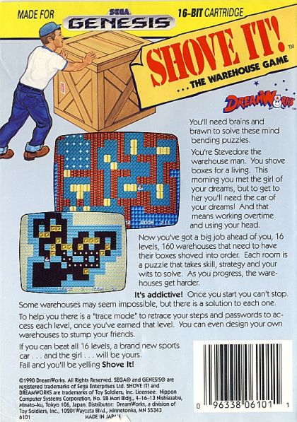 Shove It! The Warehouse Game is a top-down puzzle game based on the original gameplay of Soko-Ban Hiroyuki Imabayashi wrote for Thinking Rabbit. The player controls Stevedore, a warehouse keeper, from a top-down view. As shown on the title screen, shoving boxes will earn him money to make his dreams come true, a lovely girlfriend and a fiery red sports car.