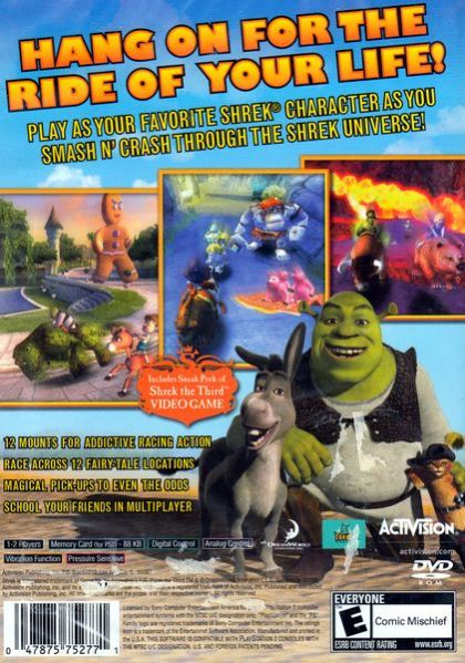 Play as your favorite Shrek character and pit your racing and combat skills against an assortment of twisted fairy-tale opponents. Grab your mount and bump, crash and slide your way across 12 fairy-tale locations. If you fall behind, don't worry - use magical pick-ups to even the odds or battle your way back by knocking your opponents off their mounts. Beat your friends to the finish line in this fun and funny smash & crash twisted fairy-tale adventure!