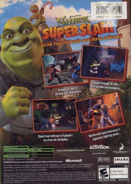 Shrek SuperSlam pits the characters from the Shrek franchise against each other in the only game that combines the twisted humor and pop culture parodies of the Shrek universe with the fast-paced action of a melee fighting game. Signature fighting moves like Shrek's "Green Storm," Donkey's "Juggle Punt," and Puss-in-Boots' "Love-Stun" bring variety and personality to the game. Fully destructible arenas like the Poison Apple Inn and Dragon's Gate have walls toppling and debris flying while a multitude of weapons, potions, and magical items spell endless melee action for up to four players.