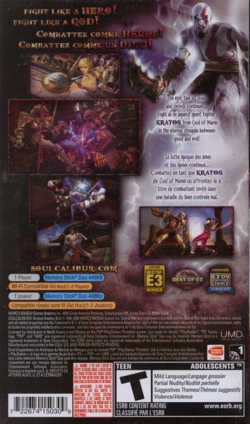 The Eternal Struggle of swords and souls continue on PSP! Soulcalibur: Broken Destiny is the latest entry in the Soulcalibur series, the premier weapons-based one-on-one fighter. Broken Destiny is the series' first release on PSP system and is the first ever portable iteration of Soulcalibur to date. Robust and challenging single-player modes, head-to-head multiplayer and gorgeous visuals make this a must-have for any fighting game fan!