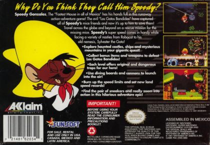 In a small Mexican village, all the mice were enjoying a fiesta until Los Gatos Bandidos, a group of cats, came and kidnapped them all. Only Slowpoke escaped and sent for his cousin, the fastest mouse in Mexico... Speedy Gonzales! Following the trail of the Bandidos, Speedy will enter each level and try to rescue as many mice as possible while chasing after cheese and avoiding natural hazards. Ariba! Ariba!