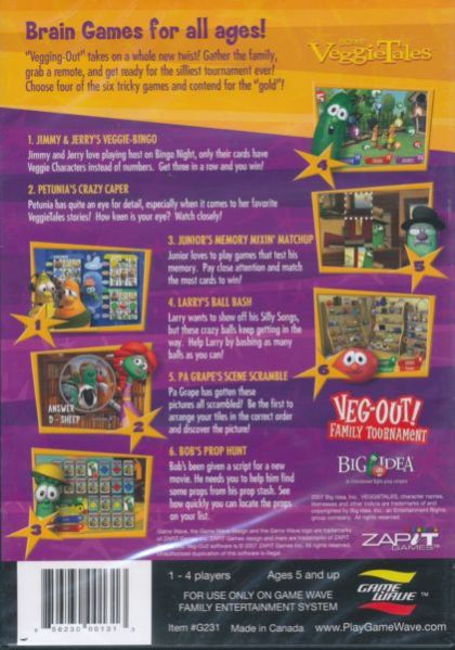 Get ready for the silliest tournament ever! This game can only be played on the GameWave entertainment system. Parents and kids can play together, up to four players. Pick from 6 different games, with 2 levels--tricky and trickier. Veg-Out with Music Videos, VeggieTales characters, video clips and more.Up to 4 players can challenge each other. Jimmy & Jerry's Veggie Bingo - Jimmy and Jerry love playing host on Bingo night, only their cards have Veggie characters instead of numbers. Get three in a row and you win. Petunia's Crazy Caper - Petunia has quite an eye for detail, especially when it comes to her favorite VeggieTales stories. How keen is your eye? Junior's Memory Mixin' Matchup - Junior loves to play games that test his memory. Pay close attention and match the most cards to win. Larry's Ball Bash - Larry wants to show off his Silly Songs, but these crazy balls keep getting in the way. Help Larry by bashing as many balls as you can. Pa Grape's Scene Scramble - Pa Grape has gotten these pictures all scrambled. Be the first to arrange your tiles in the correct order and discover the picture. Bob's Prop Hunt - Bob’s been given a script for a new movie. He needs you to help him find some props from his prop stash. See how quickly you can locate the props in your list.