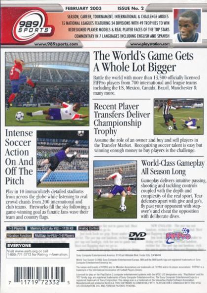 Soccer comes home as you lead your team to victory on or off the field. As a player, you'll tackle, pass, and shoot winning goals from the field. As an owner, you'll buy, sell, or trade players to create a winning team. More than 13,500 officially licensed FIFA pro players from 700 international and league teams compete in 10 stadiums around the globe. Your players can perform a variety of authentic moves, including high-flying headers, bicycle kicks, and goal-saving slide tackles.