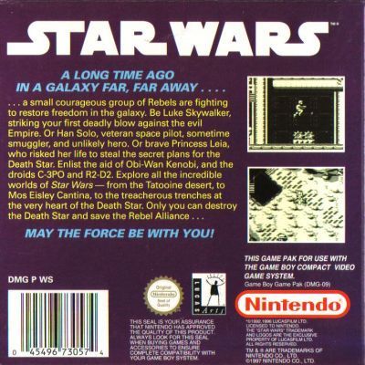 The galaxy is under attack by Imperial forces, and only a small group of Rebel warriors is fighting to restore freedom. You can play as: Luke Skywalker, the young hero; Han Solo, a space pilot and smuggler; or Princess Leia, the brave opponent of the Death Star. With the assistance of Obi-Wan Kenobi and two familiar druids, you'll journey from the Mos Eisley Cantina to the Tatooine Desert to tackle the evil forces of Darth Vader and his menacing rule. With action based on the classic film of the same title, STAR WARS delivers all of the excitement of the big screen in the form of a detailed, hand-held game.