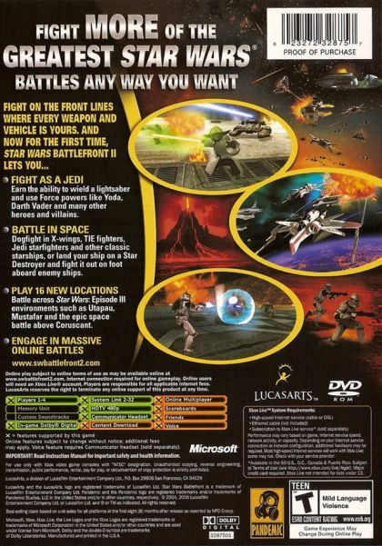 Star Wars Battlefront II adds all-new space combat, playable Jedi characters, and never-before-seen environments straight out of Star Wars: Episode III Revenge of the Sith. Fans of the original Star Wars Battlefront will also enjoy an all-new single-player experience that takes players through an epic, story-based saga centering on Darth Vader's elite 501st Legion of Stormtroopers where every action the player takes impacts the battlefront and, ultimately, the fate of the Star Wars galaxy. The game features an all-new single-player experience that takes players through an epic, story-based saga where every action the player takes impacts the battlefront and, ultimately, the fate of the Star Wars galaxy. The sequel features improved flight control, complex space combat that allows players to board enemy capital ships and battle to take over flying command posts or sabotage the ship to be used against the other faction, increased total online player numbers, and memorable multiplayer encounters in 12 new locations. All-new classic trilogy locations including the Death Star interior, classic space battles and the fight aboard the Tantive IV, Princess Leia's blockade runner Online Play capable (monthly fee may be required)