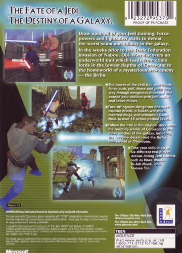 Obi-Wan, easily one of the most recognizable characters in the famous Star Wars saga, is the protagonist in this third-person adventure title for the Xbox. Using the two analog sticks on the controller, players control Obi-Wan's movement and lightsaber independently of one another. In addition to possessing consummate skill with a lightsaber, Obi-Wan is imbued with a vast array of Force powers that can be used to leap great distances, deflect laser blasts with his lightsaber, run quickly, pull enemies and objects nearer, or push them farther away. Taking place just before the events in The Phantom Menace and eventually running concurrently with it, Obi-Wan will find himself in familiar locales such as Coruscant and Theed, and will interact with NPCs. During his travels, he will contend with many of the characters from the film, as well as the Jin ha -- a new breed of enemies whose exact role will be unveiled as you progress. A Jedi Saber Arena allows players to spar with members of the Jedi Council, and offers two players the ability to go toe-to-toe.