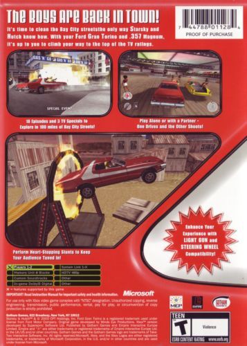 Released nearly 30 years after the debut of the television series that inspired it (and several months before the 2004 feature film remake), Starsky & Hutch is a mission-based driving game featuring the edgy, undercover cop duo and their trademark red and white Gran Torino. In the style of the TV series, core gameplay involves high-speed chases through a three-dimensional Bay City. Players are motivated to perform big jumps and other high-speed feats by more than just the goal of catching the criminal, however. Starsky and Hutch must do their job with style -- or not at all. As the heroes zip through crowded thoroughfares and crooked alleys, a "Viewer Rating" (VR) score represents the level of excitement the car chase is producing for a theoretical television audience. A steady string of successful stunts will keep the rating high, but viewers will be bored by drivers who play it safe. If the VR level drops too low, the mission is lost. Beyond the driving challenges, the game also features a good deal of shooting. One cop will draw his pistol and hang out the passenger window to auto-aim at various targets while his partner drives. In two-player games, one gamer can take charge of the shooting while the other controls the car.