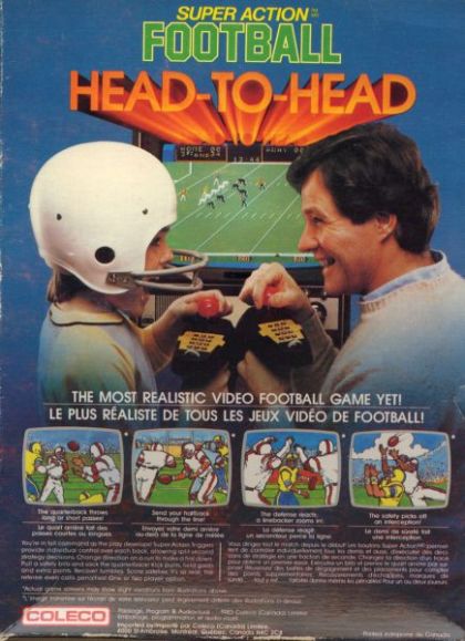 Another game in the Super Action series that makes use of Coleco's Super Action Controllers. Play against the computer or go head-to-head with a friend over 4 quarters of football action. Step back and throw the long bomb to your wide receiver dancing in the end zone, kick the field goal, or lay down a bone-crunching tackle as you control one of 3 offensive or 3 defensive players. What victory dance will you do as you dive across the goal line in the final seconds of the game?