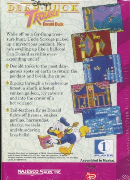 Deep Duck Trouble Starring Donald Duck, known as Donald Duck no Yottsu no Hihou in Japan, is a Sega Master System and Sega Game Gear platform game starring Donald Duck. It can be seen as a sequel to The Lucky Dime Caper Starring Donald Duck.