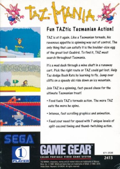 Taz-Mania is a 1992 platform game developed by Recreational Brainware and released by Sega in 1992 for the Sega Mega Drive, Sega Master System and Sega Game Gear. It is based on the cartoon series with the same name, and stars Taz the Tazmanian Devil on the search for seabird eggs. It is unrelated to the Super Nintendo and Game Boy games with the same name, aside from the Taz-Mania license.