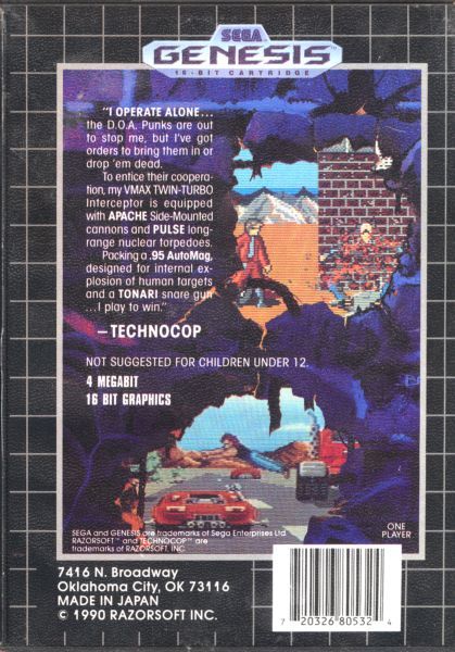 Techno Cop is set in the near future. You are a cop who seeks to clear his town of all the criminal scum. The game consists of two parts; one driving-action and one sidescrolling-action. In the first part you drive around in your red Ferrari and destroy hostile cars; in the second part, you turn somersaults over gaps, use elevators and shoot lots of enemies until you reach the boss. After having killed / caught the villain, it's back to the road again for the next mission.