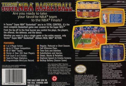 Tecmo Super NBA features real teams (all 27 contemporary teams) and a roster of real players (over 320). One or two players can compete in regular, reduced, or short seasons, or play an exhibition game. Though primarily horizontal scrolling, digitized speech and cinemas, along with a free throw point of view, add drama to the proceedings. Besides the expected elements of basketball (substitutions, penalties, steals and blocks, time-outs, overtime), Super NBA gives you the chance to call offensive plays and to program win/loss records. Has a battery to back-up season play.