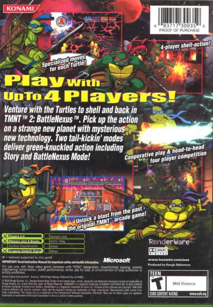 Featuring a non-linear story structure requiring more skill based play, TMNT 2 is guaranteed to offer gamers a varied and exciting gameplay experience. Complete with voice-overs from the popular TMNT animated TV series on the FoxBox, TMNT 2 allows gamers to play as Leonardo, Michelangelo, Donatello and Raphael, each with distinct characteristics and abilities. Players will need to kick, punch and slice their way past Foot Ninjas and the turtles' archenemy, The Shredder, in two exciting game modes - Story and Battle Nexus. The four-player cooperative Story Mode is based on the FoxBox's TMNT Season 2, with individual player's performance and selection affecting the story line. The Battle Nexus Mode offers slick head-to-head action. Additionally, as an added bonus for older, more nostalgic fans, the console versions provide the ability to unlock one of the classic TMNT arcade-games.