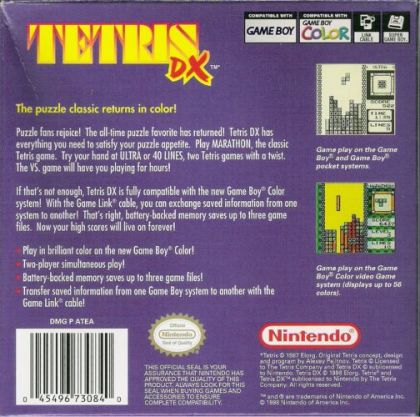 Tetris DX is a Game Boy Color game that is backwards compatible with the original Game Boy. It was released in Japan on October 21, 1998, in Europe and Australia on October 31, 1998, and in North America on November 20, 1998. Tetris DX features battery-saved high scores and three player profiles. It has a new single-player mode against the CPU, and also features two new modes of play. In "Ultra Mode," players must accumulate as many points as possible within a three-minute time period. In "40 Lines," players are timed on how quickly they can clear 40 lines of play. In addition, new music themes were added as well.