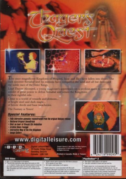 A sequel incorporating the rest of Thayer's journey was planned, but the company went bankrupt before it could be completed. In the mid-1990's, Thayer's Quest was released to home computers and CD-based consoles titled Kingdom: The Far Reaches, with the characters' names changed (Thayer became Lathan Kandor, Sorsabal became Torlock, etc., because creator Rick Dyer thought the original character and names were "too 70's") and additional animation and puzzles. In 1998 Kingdom 2: Shadoan was released, including the final two kingdoms and the final battle with Torlock. In 2005 the original Thayer's Quest was released as a DVD video game by Digital Leisure, Inc. (true to the original Halcyon version) and could be played on an ordinary DVD player using the remote control. Thayer's Quest was also released for CD-ROM by Digital Leisure, Inc.