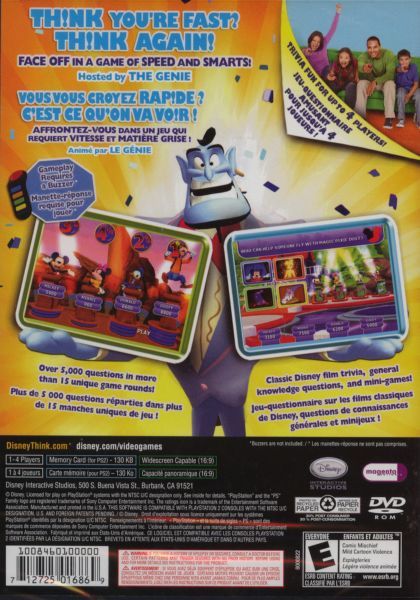 Disney TH!NK Fast: The Ultimate Trivia Showdown is a video game for the PlayStation 2 and the Wii, developed by Disney Interactive Studios. It is a game show based video game which up to four players can play. The game is hosted by the Genie from Aladdin. He asks various trivia questions that are usually based on Disney films. The PlayStation 2 version requires Buzz! buzzers.