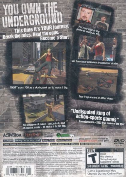 Activision's Tony Hawk Pro Skater series gears up for another run in Tony Hawk's Underground, a 3D skateboarding title offering the most radical departure from previous installments in the franchise to date. More freedom and greater customization features are at the top of the list in improvements, but the biggest change is the absence of professional skaters. Instead of mastering the moves of Tony Hawk or another athlete, players must guide a no-name skater looking for a break on the tough streets of New Jersey. Gone is the Career mode from previous titles and in its place is a Story mode that chronicles an individual's rise from obscurity to become "Skater of the Year." For the first time in the series, players can actually explore their environment without the skateboard, accessing new areas by walking up a flight of stairs, grabbing and lifting themselves onto rooftops, or shimmying across ledges. Missions have expanded as well, with players able to steal a car to complete objectives and perform other tasks to help gain notoriety and hopefully land a sponsorship deal. PlayStation 2 owners have the added benefit of online support, a console exclusive, allowing players to download created parks, tricks, and goals. Customization options have also expanded to the point where players can upload a digital picture to developer Neversoft so it can be converted into a facial map for a created skater.