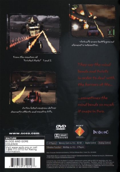 Twisted Metal: Black is a return to the roots of the Twisted Metal series, as members of the original development team behind the first two games has been brought back to craft this first entry on the PlayStation 2. The game is considerably darker than the previous four Twisted Metal games, earning it an "M" rating from the ESRB. Calypso is back again holding his Twisted Metal tournament of car combat. As before, the winner of the tournament gets a wish of their choice to be granted by Calypso. There are a total of 15 playable characters, each varying in vehicle type, driver, speed, armor, special weapon, and control. There are new characters as well as returning ones, including Junkyard Dog, Brimstone, Outlaw, Mr. Grimm, Roadkill, Crazy 8, Spectre, Dollface, Shadow, and Sweet Tooth. Players engage in vehicular combat in a variety of arenas, including downtown areas, rooftop skyscraper battles, suburban neighborhoods, prison boats, snow covered roads, highways, freeways, and drive-in movie theaters. There are also hidden arenas and characters that are unlocked by exploring and discovering hidden areas of many of the battlegrounds. Drivers compete in a last-man standing game that pits you against eight other opponents. The last person surviving wins the level and progresses onto the next stage (each character has eight levels). Weapons include character-specific special weapons, missiles, homing missiles, exploding gas cans, and environmental attacks triggered by the player. Progressing through levels not only gets you closer to the end of the game, but also unlocks CGI Movies that explain characters' pasts in greater detail. The standard camera view is placed behind the car, but can be altered by pressing the select button. Twisted Metal: Black also includes four-player simultaneous play via a split-screen, as well as cooperative modes and a last-man standing mode.