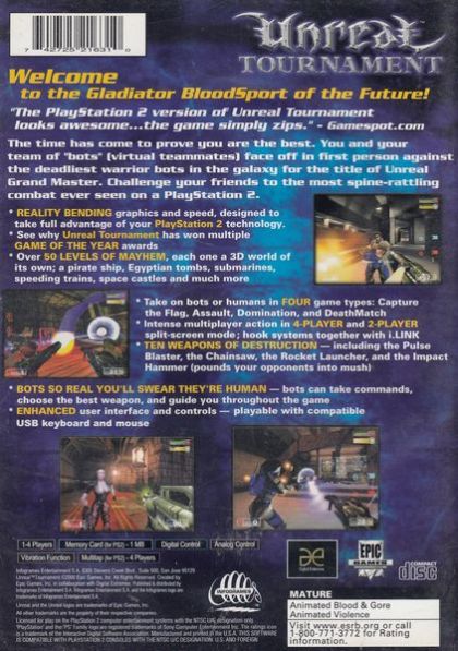 Unreal Tournament for the PlayStation 2 offers an experience that is enhanced for multiplayer gaming while maintaining a solid single-player mode. Over 30 unique levels, from speeding trains to floating castles to pirate ships, await the fan longing for team-based, first-person action. The only thing missing is the PC version's online play, due to the PS2's lack of Internet connectivity. The split-screen, multiplayer aspect of Unreal Tournament brings with it the chance to challenge up to four humans in Capture the Flag, Assault, Domination and new variations to Deathmatch. Single-player action requires players to guide their team against hardened criminal scum, some of the worst known to mankind. Novices at Unreal Tournament have the opportunity to train and learn skills in a non-intimidating environment and increase the skill level commensurate with their progress. With the capability to play against Bots (AI controlled players) , single players can simulate the multiplayer experience.