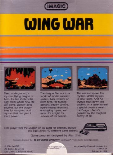 Wing War is an action game where you control a dragon. Beginning in your underground cave, your goal is to capture a sparkling diamond. To do this, you will first need to unlock the secret passage by bringing a fire, water and air crystal back to your cave. Crystals can be found by exploring the various locations available, usually you will need to destroy one of the many enemies so they turn into a crystal. Fire and water crystals can not be in the cave alone at the same time, an air crystal must be placed between them; so you will need to bring back the crystals in the order fire, air, water or water, air, fire. Once you've done this a super crystal is formed unlocking the secret passage so you can try to get the diamond! Your dragon has a limited amount of energy; being hit by enemies will cause the energy to deplete, and the game ends when all of your dragons have lost all their energy.