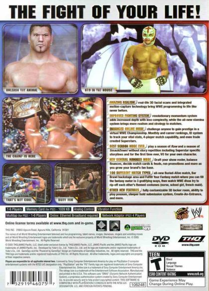 WWE SmackDown! Vs. RAW 2006 is the ultimate achievement in sports entertainment, combining two of the most successful wrestling game series of all time. It's got the deepest and most realistic wrestling experience ever, yet it's easy enough for casual gamers to pick up and play. A new fighting system and enhanced online play simulates the thrill of an actual WWE championship. Prove you're the best, as you face off with the WWE Legends in 100 different match types. Lace up your boots for the definitive wrestling experience that is WWE SmackDown! vs RAW 2006. Fully customizable 3D locker room (first time ever!) 3 levels of blood and other fan favorite first time additions A new roster of WWE Legends to add to the challenge