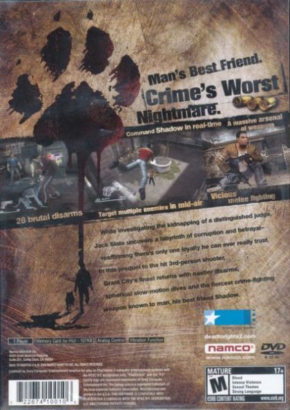 Dead to Rights II marks the return of action-hero Jack Slate and his K-9 companion, Shadow. In this super-charged sequel, Jack and Shadow find themselves once again in the squalid, mean streets of Grant City, ensnared in a labyrinth of crime, corruption and betrayal. Though he swore he'd never return to the city that left him for dead, the plight of an innocent girl draws Jack back. With Shadow at his side, he won't rest until the girl is safe. But finding her reveals a plot as dark as Grant City itself. Dead to Rights II is a third-person action shooter featuring gritty, Hong Kong cinema-style action and innovating new gameplay mechanics such as greater interaction with Shadow, brutal, all-new disarm moves, a lightning-fast 360 degree fighting engine, vicious melee weapon battles and a dramatic new spherical slow-motion diving system.