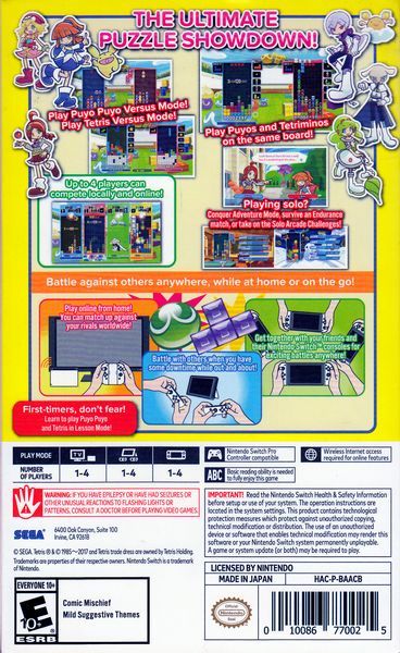 Two puzzle game juggernauts collide as Tetris®, one of the largest-selling and recognized brands in gaming history, and Puyo Puyo™ from SEGA have combined to create a fun-to-play, fast-paced, competitive party game like no other! The game has tons of different styles of gameplay – from the single-player Adventure and Challenge modes to the ferocious competition of the up-to-four player Arcade modes. There's plenty of Tetris/Puyo variety, even an in-game Shop where players can unlock new characters, new skins for Puyos and Tetriminos, new backgrounds and more.