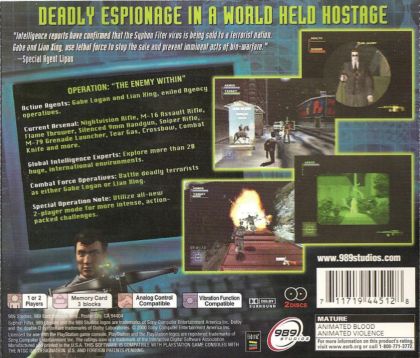 Deadly espionage in a world held hostage ... Return as Gabriel Logan, or play as Lian Xing, in Syphon Filter 2, the sequel to the blockbuster 3D action-adventure game. This time around, Gabe and Lian are framed for treason by the very agency for which they risked their lives. If that weren't enough to worry about, they must make it in time to the agency's lab in Moscow before it releases the ominous Syphon Filter virus. Explore 3 vast worlds and more than 20 thrilling levels. In an intriguing twist, some levels are played as Lian Xing, who has been infected with the dreaded virus herself. Utilizing the most deadly high-tech weaponry ever designed, enter the tense world of stealth and intrigue where it's not who you know but who's on your side. Beware the enemy within.
