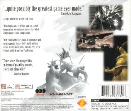 Featuring seamless 3D gameplay and animation, Final Fantasy VII contains hundreds of pre-rendered, computer-generated backgrounds and features real-time battles, vast map screens, and a complex and engrossing storyline. Published on three CDs, Final Fantasy VII will be one of the largest and most richly detailed gaming experiences ever created.