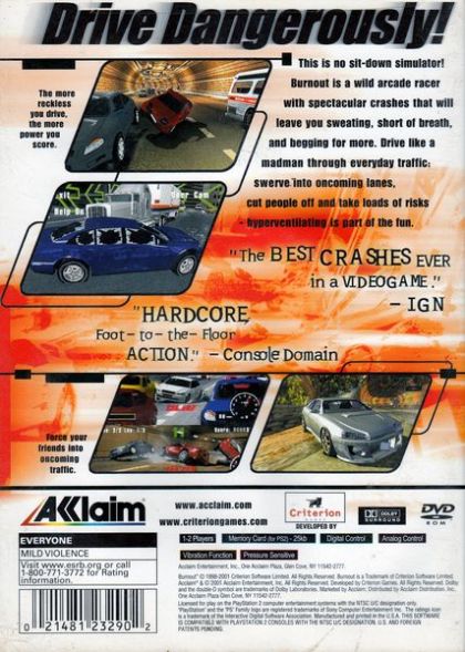 Cruise the United States and Europe on 14 awesome, traffic filled courses, through cities and into the countryside. Over 300 vehicles fill the streets and highways, making reckless racing and wild demolition a certainty. Dolby Digital Surround Sound brings the roar of screeching tires and twisting metal to life.
