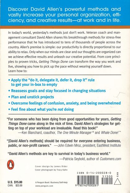 In today's world, yesterday's methods just don't work. In Getting Things Done, veteran coach and management consultant David Allen shares the breakthrough methods for stress-free performance that he has introduced to tens of thousands of people across the country. Allen's premise is simple: our productivity is directly proportional to our ability to relax. Only when our minds are clear and our thoughts are organized can we achieve effective productivity and unleash our creative potential. In Getting Things Done Allen shows how to: Apply the "do it, delegate it, defer it, drop it" rule to get your in-box to empty Reassess goals and stay focused in changing situations Plan projects as well as get them unstuck Overcome feelings of confusion, anxiety, and being overwhelmed Feel fine about what you're not doing From core principles to proven tricks, Getting Things Done can transform the way you work, showing you how to pick up the pace without wearing yourself down.