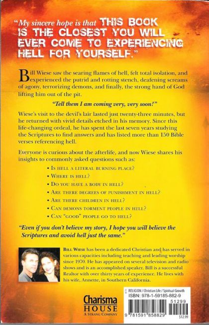 "My sincere hope is that this book is the closest you will ever come to experiencing hell for yourself"--Bill Wiese saw the searing flames of hell, felt total isolation, and experienced the putrid and rotting stench, deafening screams of agony, terrorizing demons, and finally, the strong hand of God lifting him out of the pit--"Tell them I am coming very, very soon!"Wiese’s visit to the devil’s lair lasted just twenty-three minutes, but he returned with vivid details etched in his memory. Since this life-changing ordeal, he has spent the last seven years studying the Scriptures to find answers and has listed more than 150 Bible verses referencing hell.Everyone is curious about the afterlife, and now Wiese shares his insights to commonly asked questions such as:Is hell a literal burning place? Where is hell? Do you have a body in hell? Are there Degrees of punishment in hell? Are there children in hell? Can Demons torment people in hell? Can "good" people go to hell? "Even if you don’t believe my story, I hope you will believe the Scriptures and avoid hell just the same."