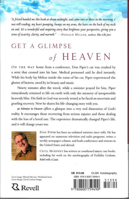 As he is driving home from a minister's conference, Baptist minister Don Piper collides with a semi-truck that crosses into his lane. He is pronounced dead at the scene. For the next 90 minutes, Piper experiences heaven where he is greeted by those who had influenced him spiritually. He hears beautiful music and feels true peace.Back on earth, a passing minister who had also been at the conference is led to pray for Don even though he knows the man is dead. Piper miraculously comes back to life and the bliss of heaven is replaced by a long and painful recovery.For years Piper kept his heavenly experience to himself. Finally, however, friends and family convinced him to share his remarkable story.