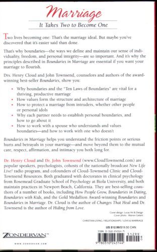 Learn how setting healthy boundaries in your marriage can strengthen--or even save--your relationship with your spouse. Most marital conflicts are boundary conflicts where one person crosses the lines of responsibility and respect. When couples learn to embrace personal responsibility and to respect each other's freedom, love is allowed to thrive. Whether you're happy in your marriage and want to keep growing, or if you're struggling with increasing disconnection, Boundaries in Marriage will give you the tools you need to: Set and maintain personal boundaries while respecting those of your partner. Understand and practice two key ingredients to a successful marriage: freedom and responsibility. Establish values that form a godly structure and architecture for your marriage. Protect your marriage from different kinds of "intruders." Work with a spouse who is resistant to boundaries. In Boundaries in Marriage, Drs. Henry Cloud and John Townsend, counselors and authors of the New York Times bestseller Boundaries, will show you how healthy marriages are marriages with boundaries. They promote love by protecting individuals.