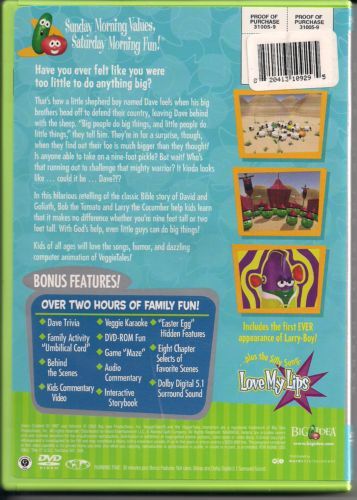 Have you ever felt too small to do a really BIG job? That's what a little shepherd boy named Dave feels when his big brothers head off to defend their country, leaving him behind with the sheep. They're in for a surprise when they find out their foe is a 9-foot pickle! But wait! Who's that running out to challenge the mighty warrior? ...could it be? ...Dave?!?