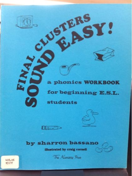 A phonics workbook for non-academic beginning learners of English as a second language. Timeless 1983 Alemany Press black and white format workpages bound into a 67 sheet turquoise book. Much visual reinforcement of basic vocabulary and essential sound contasts to enhance oral control of American English end-of-word consonant sounds.