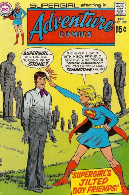 "Supergirl's Jilted Boy Friends!": Brainiac orders the Kimor Dann robot to keep being abusive to Supergirl, planning to have the robot eventually pull a scene before the Girl of Steel and blow himself up. Since Supergirl, he thinks, will blame herself for "Kim O'Ryan's" "suicide", she will have to retire. But the real Kimor Dann has made his way to Earth and taken the robot's place, and Supergirl has learned of Brainiac's plot. When Brainiac, thwarted, tries to kill Supergirl with a Kryptonite spray, she has Kimor Dann throw her the explosive device the robot was to have destroyed itself with, and uses it to blow the Kryptonite off of her. Brainiac escapes, but Supergirl takes Kimor Dann to a reformatory.