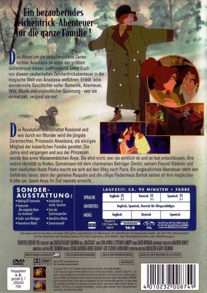 This animated adventure retells the story of the lost daughter of Russia's last czar. The evil Rasputin places a curse on the Romanov family, and Anastasia and her grandmother, Empress Maria, get separated. After growing up in an orphanage, Anastasia encounters two Russian men seeking a reward offered by Empress Maria for the return of her granddaughter. The trio travels to Paris, where they find that the empress has grown skeptical of imposters.